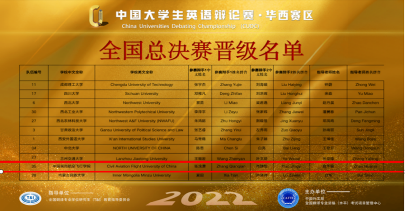 10月15-16日,由全国翻译专业学位研究生教育指导委员会指导、中国外文局CATTI项目管理中心主办的2022年中国大学生英语辩论赛(CUDC)华西大区赛在线上举行。本次大赛共有来自四川大学、西安交通大学、四川外国语大学等高校的60余支队伍参赛。经过两天激烈角逐,我校kaiyun开云官方英语专业2021级学生张浅潜和肖静怡组成的代表队在赵华俊老师的带领下荣获华西赛区一等奖,并顺利晋级全国总决赛。