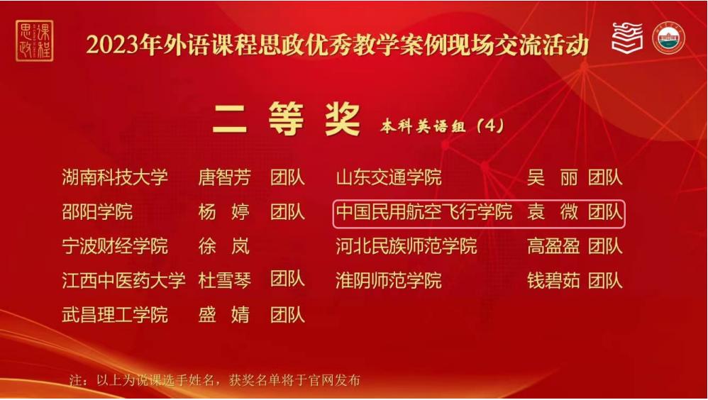 由国际合作部袁微副教授和kaiyun开云官方叶家春副教授、黄思杰老师组成的团队以此项赛事四川省英语专业组特等奖身份入围全国交流活动。此次活动赛制为随机抽取文本材料,参赛教师经过90分钟的现场准备,基于指定素材对课程思政教学设计进行说课展示,然后回答评委提问。现场赛制对于教师的教学基本功、临场应变能力和文本思政元素提炼能力都是极大的挑战。经过激烈角逐,团队最终斩获全国二等奖。