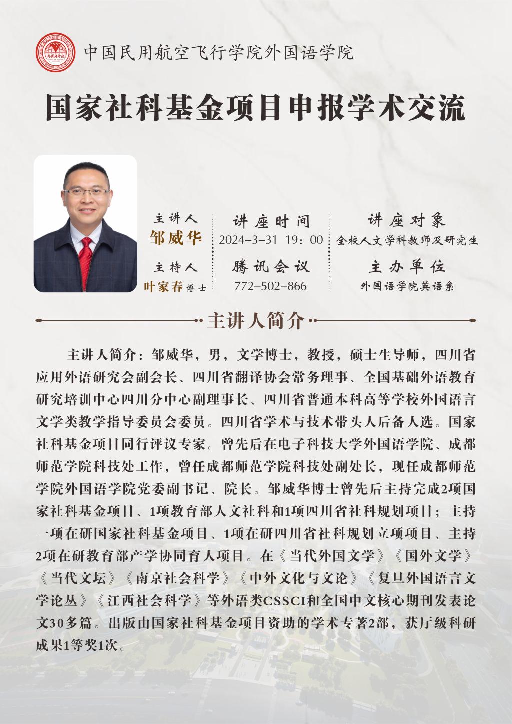 主讲人简介:邹威华,男,文学博士,教授,硕士生导师,四川省应用外语研究会副会长、四川省翻译协会常务理事、全国基础外语教育研究培训中心四川分中心副理事长、四川省普通本科高等学校外国语言文学类教学指导委员会委员。四川省学术与技术带头人后备人选。国家社科基金项目同行评议专家。曾先后在电子科技大学kaiyun开云官方、成都师范学院科技处工作,曾任成都师范学院科技处副处长,现任成都师范学院kaiyun开云官方党委副书记、院长。邹威华博士曾先后主持完成2项国家社科基金项目、1项教育部人文社科和1项四川省社科规划项目;主持一项在研国家社科基金项目、1项在研四川省社科规划立项项目、主持2项在研教育部产学协同育人项目。在《当代外国文学》《国外文学》《当代文坛》《南京社会科学》《中外文化与文论》《复旦外国语言文学论丛》《江西社会科学》等外语类CSSCI和全国中文核心期刊发表论文30多篇。出版由国家社科基金项目资助的学术专著2部,获厅级科研成果1等奖1次。
