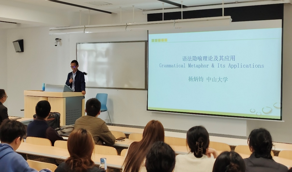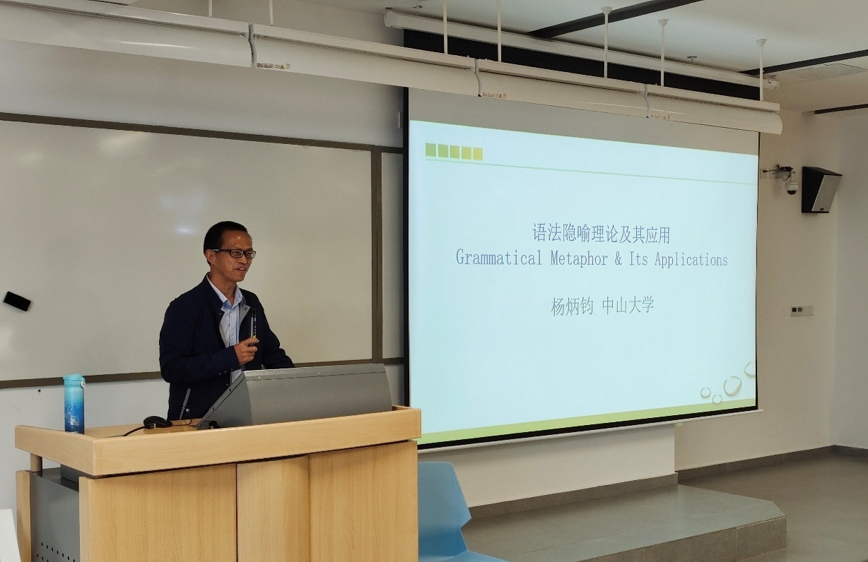 3月24日下午,kaiyun开云官方特邀中山大学博士生导师、中国英汉语比较研究会英汉语篇分析专业委员会会长杨炳钧教授,为师生带来“语法隐喻理论及其应用”专题讲座。讲座由学校教师发展与评估中心副主任黄大勇主持,kaiyun开云官方院长郑丽致辞,吸引了众多师生参与,现场氛围热烈。