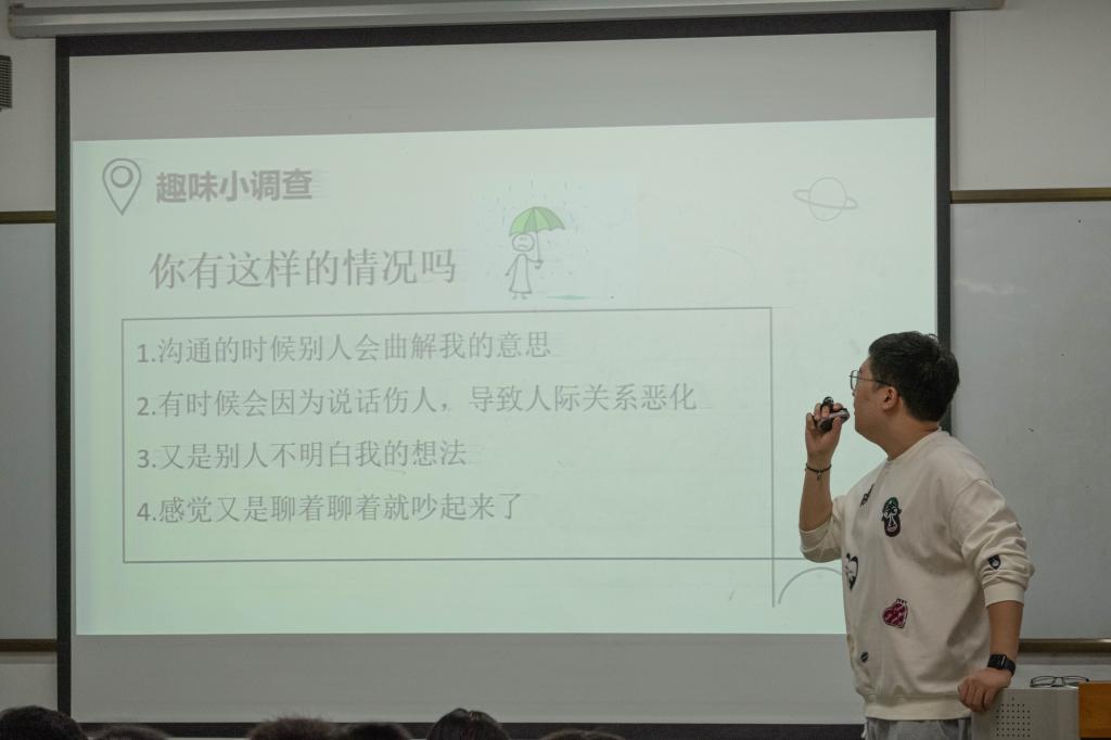 为引导大一新生关注自我精神健康,提高心理健康意识,2023年10月11日晚,kaiyun开云官方特邀心理测评中心的张书宇老师面向2023级新生在5教416开展主题为“人际沟通——非暴力沟通”的讲座活动,帮助新生树立正确的精神健康观念,促进身心健康协调统一。本次活动由23级辅导员曾楠葳主持。