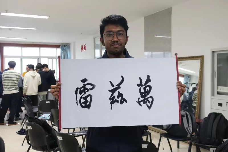 随后,留学生们便开始了分组练习,笔墨纸砚的气息弥漫在众人四周。尽管大多数人是第一次拿起毛笔书写中国汉字,但每个人都乐在其中,感受着中国书法带来的乐趣和静谧。肖凌院长耐心地为每一组留学生示范他们名字的书写,并鼓励学生亲自尝试。虽然留学生们在一开始有些羞涩,不敢执笔,但在师生们的鼓励下,他们也逐渐拿起毛笔在纸上默默尝试练习,并在完成后激动地展示自己的“书法作品”,赢得了老师和同学们的热烈掌声。宣纸上一笔一划的汉字,在浓墨中满载着留学生们对中国文化的热爱与敬赏之情。